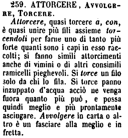 | Attorcere, Avvolgere, Torcere - Attorcere, quasi torcere a, con, è quasi unire più fili assieme torcendoli per farne uno di tanto più forte quanti sono i capi in esso raccolti; si fanno simili attorcimenti anche di vimini o di altri consimili ramicelli pieghievoli. Si torce un filo solo da chi lo fila. Si torce panno inzuppato d'acqua acciò ne venga fuora quanto più può, e possa quindi meglio e più prontamente asciugare. Avvolgere in carta o altro è un fasciare alla meglio e in fretta. [immagine] |