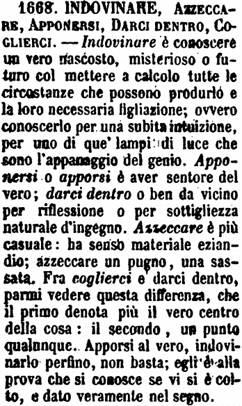 | Indovinare, Azzeccare, Apponersi, Darci dentro, Coglierci - Indovinare è conoscere un vero nascosto, misterioso o futuro col mettere a calcolo tutte le circostanze che possono produrlo e la loro necessaria figliazione; ovvero conoscerlo per una subita intuizione, per uno di que' lampi di luce che sono l'appannaggio del genio. Apponersi o apporsi è avere sentore del vero; darci dentro o ben da vicino per riflessione o per sottigliezza naturale d'ingegno. Azzeccare è più casuale: ha senso materiale eziandio; azzeccare un pugno, una sassata. Fra coglierci e darci dentro, parmi vedere questa differenza, che il primo denota più il vero centro della cosa: il secondo, un punto qualunque. Apporsi al vero, indovinarlo perfino, non basta; egli è alla prova che si conosce se vi si è colto, e dato veramente nel segno. [immagine] |