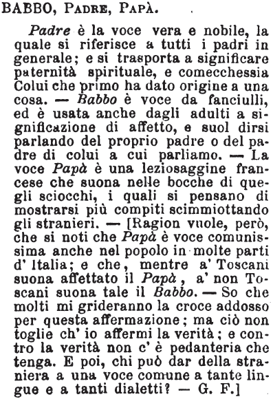 | Babbo, Padre, Papà - Padre è la voce vera e nobile, la quale si riferisce a tutti i padri in generale; e si trasporta a significare paternità spirituale, e comecchessia Colui che primo ha dato origine a una cosa. - Babbo è voce da fanciulli, ed è usata anche dagli adulti a significazione di affetto, e suol dirsi parlando del proprio padre o del padre di colui a cui parliamo. - La voce Papà è una leziosaggine francese che suona nelle bocche di quegli sciocchi, i quali si pensano di mostrarsi più compiti scimmiottando gli stranieri. -[Ragion vuole, però, che si noti che Papà è voce comunissima anche nel popolo in molte parti d'Italia; e che, mentre a' Toscani suona affettato il Papà, a' non Toscani suona tale il Babbo. - So che molti mi grideranno la croce addosso per questa affermazione; ma ciò non toglie ch'io affermi la verità; e contro la verità non c'è pedanteria che tenga. E poi, chi può dar della straniera a una voce comune a tante lingue e a tanti dialetti? - G.F.] [immagine] |