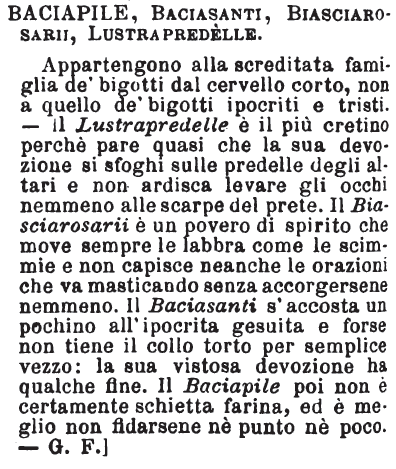 | Baciapile, Baciasanti, Biasciarosarii, Lustrapredelle - Appartengono alla screditata famiglia de' bigotti dal cervello corto, non a quello de' bigotti ipocriti e tristi. - Il Lustrapredelle è il più cretino perchè pare quasi che la sua devozione si sfoghi sulle predelle degli altari e non ardisca levare gli occhi nemmeno alle scarpe del prete. Il Biasciarosarii è un povero di spirito che move sempre le labbra come le scimmie e non capisce neanche le orazioni che va masticando senza accorgersene nemmeno. Il Baciasanti s'accosta un pochino all'ipocrita gesuita e forse non tiene il collo torto per semplice vezzo: la sua vistosa devozione ha qualche fine. Il Baciapile poi non è certamente schietta farina, ed è meglio non fidarsene nè punto nè poco. - G. F.] [immagine] |