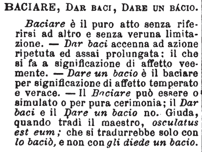 | Baciare, Dar baci, Dare un bacio - Baciare è il puro atto senza riferirsi ad altro e senza veruna limitazione. - Dar baci accenna ad azione ripetuta ed assai prolungata; il che si fa a significazione di affetto veemente. - Dare un bacio è il baciare per significazione di affetto temperato e verace. - Il Baciare può essere o simulato o per pura cerimonia: il Dar baci e il Dare un bacio no. Giuda, quando tradì il maestro, osculatus est eum; che si tradurrebbe solo con lo baciò, e non con gli diede un bacio. [immagine] |