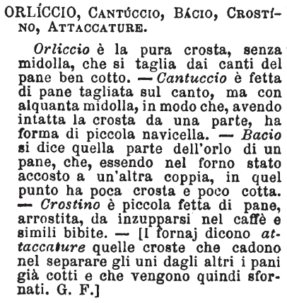 | Orliccio, Cantuccio, Bacio, Crostino, Attaccature - Orliccio è la pura crosta, senza midolla, che si taglia dai canti del pane ben cotto. - Cantuccio è fetta di pane tagliata sul canto, ma con alquanta midolla, in modo che, avendo intatta la crosta da una parte, ha forma di piccola navicella. - Bacio si dice quella parte dell'orlo di un pane, che, essendo nel forno stato accosto a un'altra coppia, in quel punto ha poca crosta e poco cotta. - Crostino è piccola fetta di pane, arrostita, da inzupparsi nel caffè e simili bibite. - [I fornaj dicono attaccature quelle croste che cadono nel separare gli uni dagli altri i pani già cotti e che vengono quindi sfornati. G. F.] [immagine] |