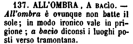 | All'ombra, A bacio - All'ombra è ovunque non batte il sole; in modo ironico vale in prigione; a bacìo diconsi i luoghi posti verso tramontana. [immagine] |