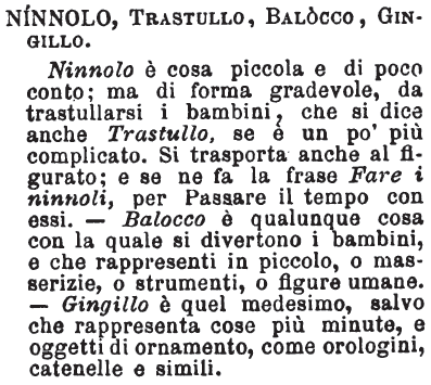 | Ninnolo, Trastullo, Balocco, Gingillo - Ninnolo è cosa piccola e di poco conto; ma di forma gradevole, da trastullarsi i bambini, che si dice anche Trastullo, se è un po' più complicato. Si trasporta anche al figurato; e se ne fa la frase Fare i ninnoli, per Passare il tempo con essi. - Balocco è qualunque cosa con la quale si divertono i bambini, e che rappresenti in piccolo, o masserizie, o strumenti, o figure umane. - Gingillo è quel medesimo, salvo che rappresenta cose più minute, e oggetti di ornamento, come orologini, catenelle e simili. [immagine] |
