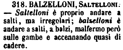 | Balzelloni, Saltelloni - Saltelloni è proprio andare a salti, ma irregolari; balzelloni è andare a salti, a balzi, malfermo però sulle gambe e accennando quasi di cadere. [immagine] |
