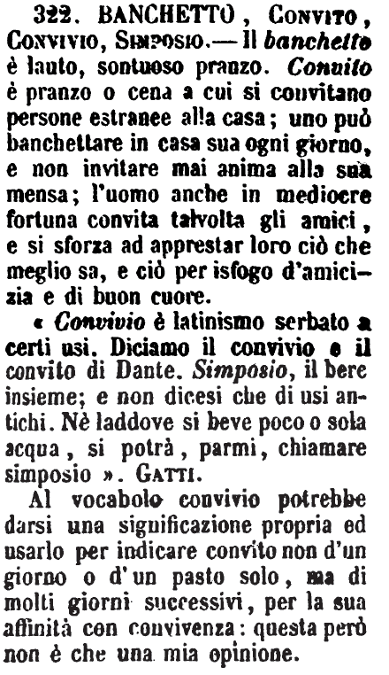 «Convivio è latinismo serbato a certi usi. Diciamo il convivio e il convito di Dante. Simposio, il bere insieme; e non dicesi che di usi antichi. Nè laddove si beve poco o sola acqua, si potrà, parmi, chiamare simposio». Gatti. Al vocabolo convivio potrebbe darsi una significazione propria ed usarlo per indicare convito non d'un giorno o d'un pasto solo, ma di molti giorni successivi, per la sua affinità con convivenza: questa però non è che una mia opinione. [immagine] |