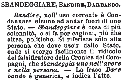 | Sbandeggiare, Bandire, Darbando - Bandire, nell'uso corrente è Condannare alcuno ad andar fuori di uno Stato. - Sbandeggiare è cosa di più solennità, e si fa per cagioni, più che altro, politiche. Si riferisce solo alla persona che deve uscir dallo Stato, onde si scorge facilmente il ridicolo del falsificatore della Cronica del Compagni, che sbandeggia uno nell'avere e nella persona. - La frase Dare bando è generica, e indica l'atto. [immagine] |