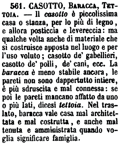 | Casotto, Baracca, Tettoia - Il casotto è piccolissima casa o stanza, per lo più di legno, e allora posticcia e levereccia: ma qualche volta anche di materiale che si costruisce apposta nel luogo e per l'uso voluto; casotto de' gabellieri, casotto de' polli, de' cani, ecc. La baracca è meno stabile ancora, le pareti non sono dappertutto intiere, è più sdruscita e mal connessa: se poi le pareti mancano affatto da uno o più lati, dicesi tettoia. Nel traslato, baracca vale casa mal architettata e mal costrutta, e anche mal tenuta e amministrata quando voglia significare famiglia. [immagine] |