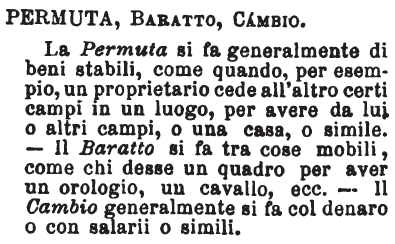 | Permuta, Baratto, Cambio - La Permuta si fa generalmente di beni stabili, come quando, per esempio, un proprietario cede all'altro certi campi in un luogo, per avere da lui o altri campi, o una casa, o simile. - Il Baratto si fa tra cose mobili, come chi desse un quadro per aver un orologio, un cavallo, ecc. - Il Cambio generalmente si fa col denaro o con salarii o simili. [immagine] |