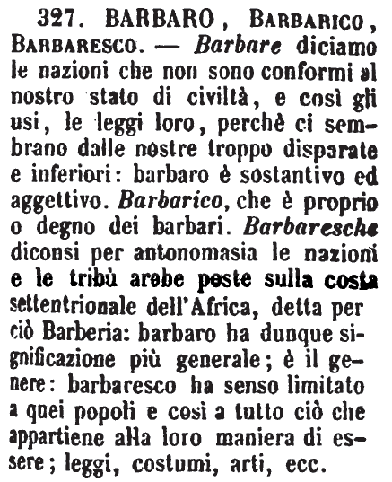 | Barbaro, Barbarico, Barbaresco - Barbare diciamo le nazioni che non sono conformi al nostro stato di civiltà, e così gli usi, le leggi loro, perchè ci sembrano dalle nostre troppo disparate e inferiori: barbaro è sostantivo ed aggettivo. Barbarico, che è proprio o degno dei barbari. Barbaresche diconsi per antonomasia le nazioni e le tribù arabe poste sulla costa settentrionale dell'Africa, detta per ciò Barberia: barbaro ha dunque significazione più generale; è il genere: barbaresco ha senso limitato a quei popoli e così a tutto ciò che appartiene alla loro maniera di essere; leggi, costumi, arti, ecc. [immagine] |