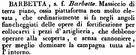 | Barbetta - s. f. Barbette. Massiccio di terra piano, ossia piattaforma non molto elevata, che ordinariamente si fa negli angoli fiancheggiati delle opere di fortificazione per collocarvi i pezzi d'artiglieria, che debbono operare alla scoperta, e senza cannoniere, per meglio dominare la campagna tutta all'intorno. [immagine] |