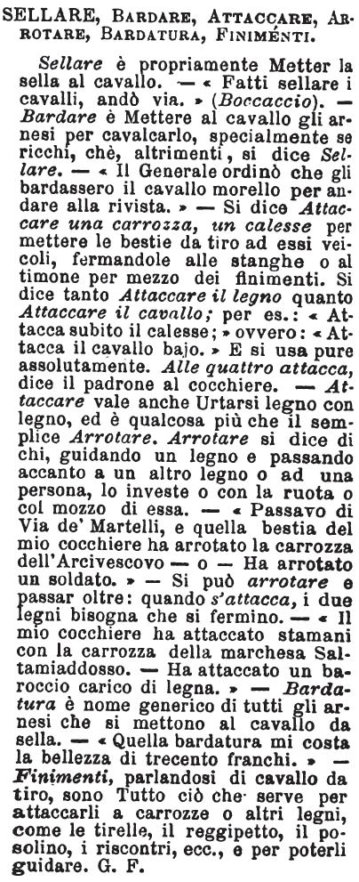 | Sellare, Bardare, Attaccare, Arrotare, Bardatura, Finimenti - Sellare è propriamente Metter la sella al cavallo. - «Fatti sellare i cavalli, andò via.» (Boccaccio). - Bardare è Mettere al cavallo gli arnesi per cavalcarlo, specialmente se ricchi, chè, altrimenti, si dice Sellare. - «Il Generale ordinò che gli bardassero il cavallo morello per andare alla rivista.» - Si dice Attaccare una carrozza, un calesse per mettere le bestie da tiro ad essi veicoli, fermandole alle stanghe o al timone per mezzo dei finimenti. Si dice tanto Attaccare il legno quanto Attaccare il cavallo; per es.: «Attacca subito il calesse;» ovvero: «Attacca il cavallo bajo.» E si usa pure assolutamente. Alle quattro attacca, dice il padrone al cocchiere. - Attaccare vale anche Urtarsi legno con legno, ed è qualcosa più che il semplice Arrotare. Arrotare si dice di chi, guidando un legno e passando accanto a un altro legno o ad una persona, lo investe o con la ruota o col mozzo di essa. - «Passavo di Via de' Martelli, e quella bestia del mio cocchiere ha arrotato la carrozza dell'Arcivescovo - o - Ha arrotato un soldato.» - Si può arrotare e passar oltre: quando s'attacca, i due legni bisogna che si fermino. - «Il mio cocchiere ha attaccato stamani con la carrozza della marchesa Saltamiaddosso. - Ha attaccato un baroccio carico di legna.» -Bardatura è nome generico di tutti gli arnesi che si mettono al cavallo da sella. - «Quella bardatura mi costa la bellezza di trecento franchi.» - Finimenti, parlandosi di cavallo da tiro, sono Tutto ciò che serve per attaccarli a carrozze o altri legni, come le tirelle, il reggipetto, il posolino, i riscontri, ecc., e per poterli guidare. G. F. [immagine] |