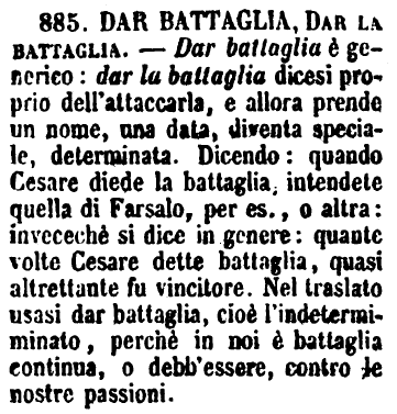 | Dar battaglia, Dar la battaglia - Dar battaglia è generico: dar la battaglia dicesi proprio dell'attaccarla, e allora prende un nome, una data, diventa speciale, determinata. Dicendo: quando Cesare diede la battaglia, intendete quella di Farsalo, per es., o altra: invecechè si dice in genere: quante volte Cesare dette battaglia, quasi altrettante fu vincitore. Nel traslato usasi dar battaglia, cioè l'indeterminato, perchè in noi è battaglia continua, o debb'essere, contro le nostre passioni. [immagine] |