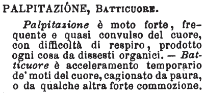 | Palpitazione, Batticuore - Palpitazione è moto forte, frequente e quasi convulso del cuore, con difficoltà di respiro, prodotto ogni cosa da dissesti organici. - Batticuore è acceleramento temporario de' moti del cuore, cagionato da paura, o da qualche altra forte commozione. [immagine] |