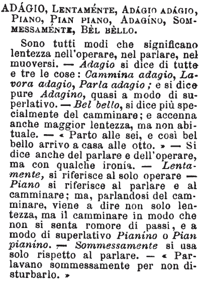 | Adagio, Lentamente, Adagio adagio, Piano, Pian piano, Adagino, Sommessamente, Bel bello - Sono tutti modi che significano lentezza nell'operare, nel parlare, nel muoversi. - Adagio si dice di tutte e tre le cose: Cammina adagio, Lavora adagio, Parla adagio; e si dice pure Adagino, quasi a modo di superlativo. - Bel bello, si dice più specialmente del camminare; e accenna anche maggior lentezza, ma non abituale. - «Parto alle sei, e così bel bello arrivo a casa alle otto.» - Si dice anche del parlare e dell'operare, ma con qualche ironia. - Lentamente, si riferisce al solo operare - Piano si riferisce al parlare e al camminare; ma, parlandosi del camminare, viene a dire non solo lentezza, ma il camminare in modo che non si senta romore di passi, e a modo di superlativo Pianino o Pian pianino. - Sommessamente si usa solo rispetto al parlare. - «Parlavano sommessamente per non disturbarlo.» [immagine] |