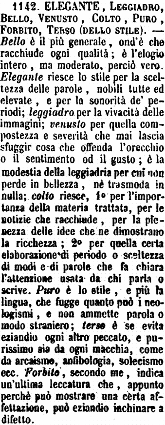 | Elegante, Leggiadro, Bello, Venusto, Colto, Puro, Forbito, Terso (dello stile) - Bello è il più generale, ond'è che racchiude ogni qualità; è l'elogio intero, ma noderato, perciò vero. Elegante riesce lo stile per la sceltezza delle parole, nobili tutte ed elevate, e per la sonorità de' periodi; leggiadro per la vivacità delle immagini; venusto per quella compostezza e severità che mai lascia sfuggir cosa che offenda l'orecchio o il sentimento od il gusto; è la modestia della leggiadria per cui non perde in bellezza, nè trasmoda in nulla; colto riesce, 1° per l'importanza della materia trattata, per le notizie che racchiude, per la pienezza delle idee che ne dimostrano la ricchezza; 2° per quella certa elaborazione di periodo o sceltezza di modi e di parole che fa chiara l'attenzione usata da chi parla o scrive. Puro è lo stile, e più la lingua, che fugge quanto può i neologismi, e non ammette parola o modo straniero; terso è se evita eziandio ogni altro peccato, e purissimo sia da ogni macchia, come da arcaismo, anfibologia, solecismo ecc. Forbito, secondo me, indica un'ultima leccatura che, appunto perchè può mostrare una certa affettazione, può eziandio inchinare a difetto. [immagine] |