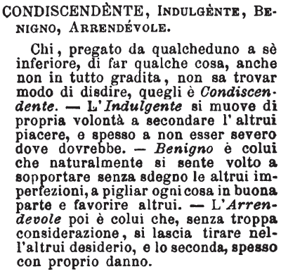| Condiscendente, Indulgente, Benigno, Arrendevole - Chi, pregato da qualcheduno a sè inferiore, di far qualche cosa, anche non in tutto gradita, non sa trovar modo di disdire, quegli è Condiscendente. - L'Indulgente si muove di propria volontà a secondare l'altrui piacere, e spesso a non esser severo dove dovrebbe. - Benigno è colui che naturalmente si sente volto a sopportare senza sdegno le altrui imperfezioni, a pigliar ogni cosa in buona parte e favorire altrui. - L' Arrendevole poi è colui che, senza troppa considerazione, si lascia tirare nell'altrui desiderio, e lo seconda, spesso con proprio danno. [immagine] |