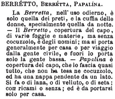 | Berretta, Berretto, Berrettino - Berretta è quella de' preti: berretto è quello de' giudici, e quello che sotto tante foggie viene usato dagli uomini; il berretto da notte in molti luoghi è detto berrettino. [immagine] |