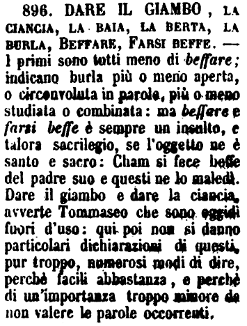 | Dare il giambo, La ciancia, La baia, La berta, La burla, Beffare, Farsi beffe - I primi sono tutti meno di beffare; indicano burla più o meno aperta, o circonvoluta in parole, più o meno studiata o combinata: ma beffare e farsi beffe è sempre un insulto, e talora sacrilegio, se l'oggetto ne è santo e sacro: Cham si fece beffe del padre suo e questi ne lo maledì. Dare il giambo e dare la ciancia, avverte Tommaseo che sono oggidì fuori d'uso: qui poi non si danno particolari dichiarazioni di questi, pur troppo, numerosi modi di dire, perchè facili abbastanza, e perchè di un'importanza troppo minore da non valere le parole occorrenti. [immagine] |