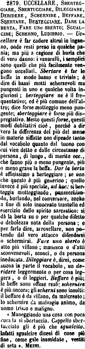 Uccellare, Sberteggiare, Sbertucciare, Dileggiare, Deridere, Schernire, Beffare, Sbertare, Berteggiare, Dare la berta, Fare uno sberto; Sgualcire; Scherno, Ludibrio - Uccellare è far cadere altrui in inganno, onde resti preso in qualche pania; ma più a cagione di burla che di vero danno: i vanarelli, i semplici sono quelli che più facilmente vengono uccellati. Sbertare è far le beffe in modo basso e triviale; è dire di bassi motti scherzevoli ma pungenti in uno e qualche volta ingiuriosi; berteggiare ne è il frequentativo; ed è più comune dell'altro; dice forse motteggio meno pungente; sberteggiare è forse più dispregiativo. Metto questi forse, questi modi dubitativi cioè, perchè a dir vero la differenza del più del meno in materie siffatte non dipende tanto dal vocabolo quanto dal tuono con cui vien detto e dalle circostanze di persona, di luogo, di merito ecc., che fanno più o meno pungente, più o meno grave la beffa. Dar la berta è affinissimo a berteggiare; se non che questo è più generico; quello invece è più speciale, ad hoc; si berteggia motteggiando, punzecchiando, burlando, nel conversare, anche a fine di solo innocente trastullo ed esercizio dello spirito sarcastico; si dà la berta su o per qualche difetto o debolezza nota della persona; e per farla dire, arrovellare, non potendo dal vero attacco difendersi o schermirsi. Fare uno sberto è atto più villano; manesco o d'atti sconvenevoli, sconci, o da persona ineducata. Dileggiare è, direi, come suona in parte il vocabolo, un deridere leggermente o per cosa leggera, o di leggieri. Beffare è più; le beffe sono offese reali; schernire è più ancora; gli scherni sono insulti: il beffare è da villano, da malcreato; lo schernire da malvagio animo, da uomo tristo e maligno.