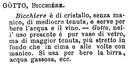 | Gotto, Bicchiere - Bicchiere è di cristallo, senza manico, di mediocre tenuta, e serve per bere l'acqua e il vino. - Gotto, nell'uso presente è pur vaso di vetro, ma di maggior tenuta, più stretto in fondo che in cima e alle volte con manico. Si usa per bere la birra, acqua gassosa, ecc. [immagine] |
