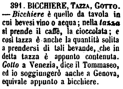 | Bicchiere, Tazza, Gotto - Bicchiere è quello da tavola in cui bevesi vino o acqua; nella tazza si prende il caffè, la cioccolata; e così tazza è anche la quantità solita a prendersi di tali bevande, che in detta tazza è appunto contenuta. Gotto a Venezia, dice il Tommaseo, ed io soggiungerò anche a Genova, equivale appunto a bicchiere. [immagine] |