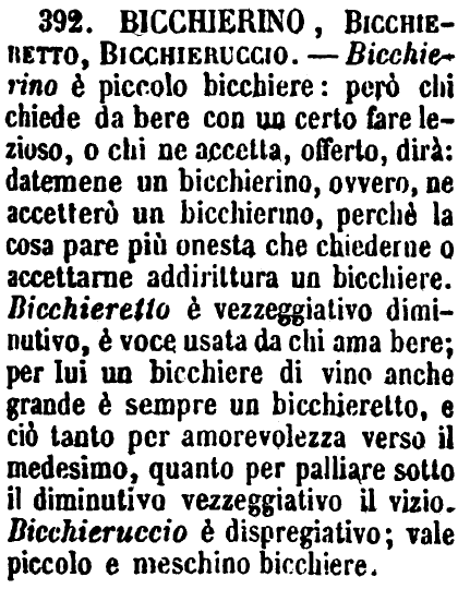 | Bicchierino, Bicchieretto, Bicchieruccio - Bicchierino è piccolo bicchiere: però chi chiede da bere con un certo fare lezioso, o chi ne accetta, offerto, dirà: datemene un bicchierino, ovvero, ne accetterò un bicchierino, perchè la cosa pare più onesta che chiederne o accettarne addirittura un bicchiere. Bicchieretto è vezzeggiativo diminutivo, è voce usata da chi ama bere; per lui un bicchiere di vino anche grande è sempre un bicchieretto, e ciò tanto per amorevolezza verso il medesimo, quanto per palliare sotto il diminutivo vezzeggiativo il vizio. Bicchieruccio è dispregiativo; vale piccolo e meschino bicchiere. [immagine] |