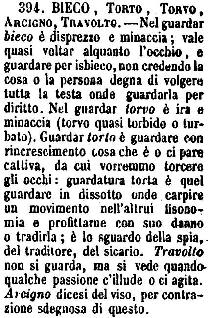 | Bieco, Torto, Torvo, Arcigno, Travolto - Nel guardar bieco è disprezzo e minaccia; vale quasi voltar alquanto l'occhio, e guardare per isbieco, non credendo la cosa o la persona degna di volgere tutta la testa onde guardarla per diritto. Nel guardar torvo è ira e minaccia (torvo quasi torbido o turbato). Guardar torto è guardare con rincrescimento cosa che è o ci pare cattiva, da cui vorremmo torcere gli occhi: guardatura torta è quel guardare in dissotto onde carpire un movimento nell'altrui fisonomia e profittarne con suo danno o tradirla; è lo sguardo della spia, del traditore, del sicario. Travolto non si guarda, ma si vede quando qualche passione c'illude o ci agita. Arcigno dicesi del viso, per contrazione sdegnosa di questo. [immagine] |