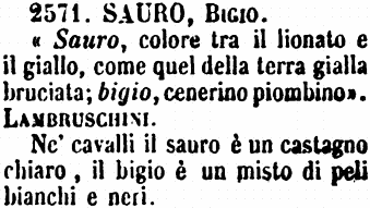 | Sauro, Bigio - «Sauro, colore tra il lionato e il giallo, come quel della terra gialla bruciata; bigio, cenerino piombino». Lambruschini.