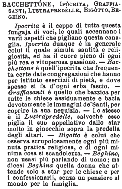 | Bacchettone, Ipocrita, Graffianti, Lustrapredelle, Bigotto, Beghino - Ipocrita è il ceppo di tutta questa fungaja di voci, le quali accennano i varii aspetti che pigliano questa canaglia. Ipocrita dunque è in generale colui il quale simula santità e religiosità, ed ha il cuore pieno di ogni più rea e vituperosa passione. - Bacchettone è quell’ipocrita che frequenta certe date congregazioni che hanno per istituto esercizii di pietà, e dove spesso si fa d’ogni erba fascio. - Graffiasanti è quello che bazzica per tutte le chiese assiduamente e bacia devotamente le immagini de’ Santi, per coprire la sua nequizia. – Lo stesso è il Lustrapredelle, salvochè esso piglia il suo appellativo dallo star molto in ginocchio sopra la predella degli altari. - Bigotto è colui che osserva scrupolosamente ogni più minuta pratica religiosa, e di ogni minima cosa si scandolezza. - Beghino, non usasi più parlando di uomo; ma dicesi Beghina quella donna che attende solo a star per le chiese e per i confessionarii, senza un pensiero al mondo per la famiglia. [immagine] |