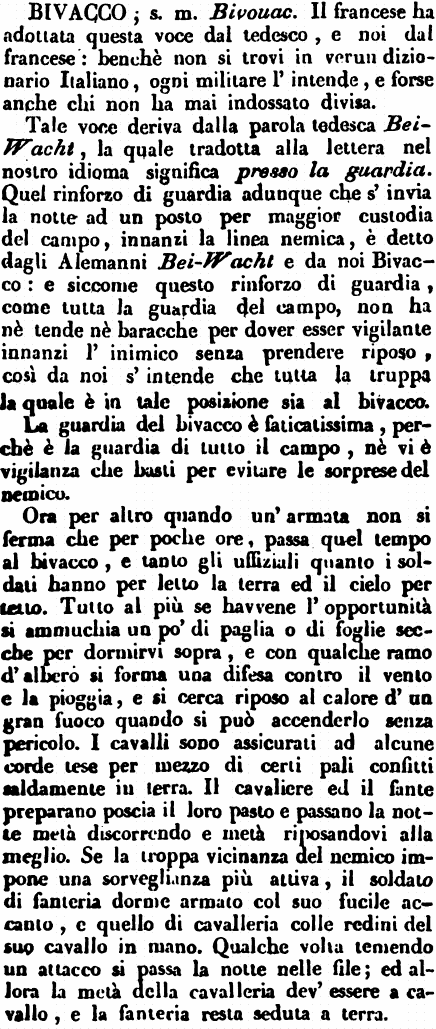 | Bivacco - s. m. Bivouac. Il francese ha adottata questa voce dal tedesco, e noi dal francese: benchè non si trovi in verun dizionario Italiano, ogni militare l'intende, e forse anche chi non ha mai indossato divisa.