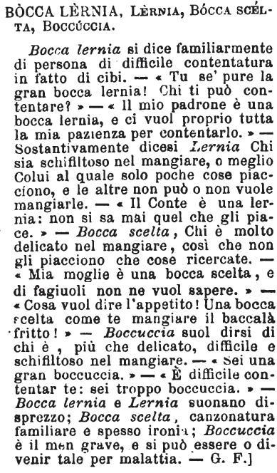 | Bocca Lernia, Lernia, Bocca scelta, Boccuccia - Bocca lernia si dice familiarmente di persona di difficile contentatura in fatto di cibi. - «Tu se' pure la gran bocca lernia! Chi ti può contentare?» - «Il mio padrone è una bocca lernia, e ci vuol proprio tutta la mia pazienza per contentarlo.» - Sostantivamente dicesi Lernia Chi sia schifiltoso nel mangiare, o meglio Colui al quale solo poche cose piacciono, e le altre non può o non vuole mangiarle. - «Il Conte è una lernia: non si sa mai quel che gli piace.» - Bocca scelta, Chi è molto delicato nel mangiare, così che non gli piacciono che cose ricercate. - «Mia moglie è una bocca scelta, e di fagiuoli non ne vuol sapere.» - «Cosa vuol dire l'appetito! Una bocca scelta come te mangiare il baccalà fritto!» - Boccuccia suol dirsi di chi è, più che delicato, difficile e schifiltoso nel mangiare. - «Sei una gran boccuccia.» - «E' difficile contentar te: sei troppo boccuccia.» - Bocca lernia e Lernia suonano disprezzo; Bocca scelta, canzonatura familiare e spesso ironia; Boccuccia è il men grave, e si può essere o divenir tale per malattia. - G. F.] [immagine] |