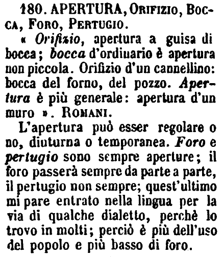 L'apertura può esser regolare o no, diuturna o temporanea. Foro e pertugio sono sempre aperture; il foro passerà sempre da parte a parte, il pertugio non sempre; quest'ultimo mi pare entrato nella lingua per la via di qualche dialetto, perchè lo trovo in molti; perciò è più dell'uso del popolo e più basso di foro. [immagine] |
