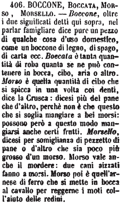 | Boccone, Boccata, Morso, Morsello - Boccone, oltre i due significati detti quì sopra, nel parlar famigliare dice pure un pezzo di qualche cosa d'uso domestico, come un boccone di legno, di spago, di carta ecc. Boccata è tanta quantità di roba quanta se ne può contenere in bocca, cibo, aria o altro. Morso è quella quantità di cibo che si spicca in una volta coi denti, dice la Crusca: dicesi più del pane che d'altro, perchè non è che questo che si soglia mangiare a bei morsi: possono però a questo modo mangiarsi anche certi frutti. Morsello, dicesi per somiglianza di pezzetto di pane o d'altro che sia poco più grosso d'un morso. Morso vale anche il mordere: due cani aizzati fanno a morsi. Morso poi è quell'arnese di ferro che si mette in bocca al cavallo per reggerne i moti coll'aiuto delle redini. [immagine] |