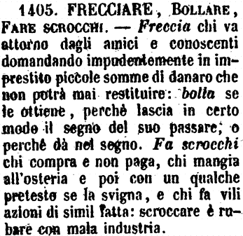 | Frecciare, Bollare, Fare scrocchi - Freccia chi va attorno dagli amici e conoscenti domandando impudentemente in imprestito piccole somme di danaro che non potrà mai restituire: bolla se le ottiene, perchè lascia in certo modo il segno del suo passare, o perchè dà nel segno. Fa scrocchi chi compra e non paga, chi mangia all'osteria e poi con un qualche pretesto se la svigna, e chi fa vili azioni di simil fatta: scroccare è rubare con mala industria. [immagine] |