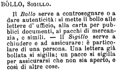 | Bollo, Sigillo - Il Bollo serve a controsegnare o a dare autenticità: si mette il bollo alle lettere d'ufficio, alla carta per pubblici documenti, ai pacchi di mercanzia, e simili. - Il Sigillo serve a chiudere e ad assicurare: è particolare di una persona. Una lettera già bollata si sigilla; un pacco si sigilla per assicurarsi che non sia aperto, e così di altre cose. [immagine] |