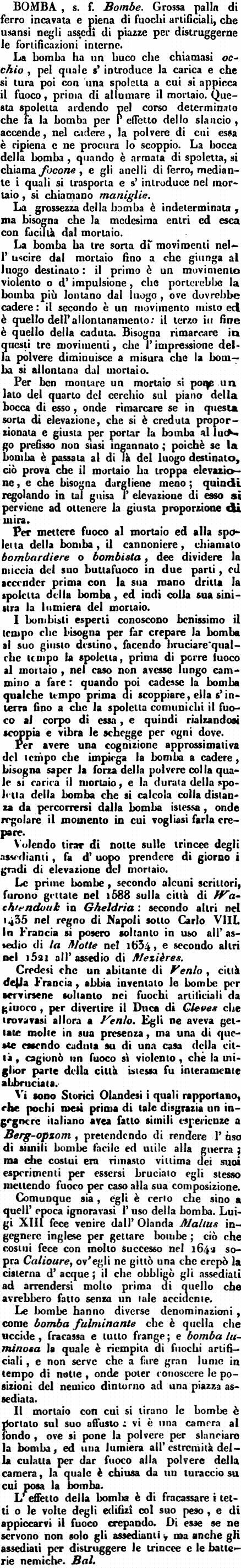 | Bomba - Questa voce deriva dal rumore che fa la bomba scoppiando. Fu detto essere stata inventata a Rimini da Pandolfo Malatesta nel 1457; ma un secolo innanzi, nelle guerre che sostenne il Brabante contro Luigi di Macle conte di Fiandra, i Brabanzoni lanciarono delle bombe alla battaglia di Santuliet nel 1556. [immagine] |