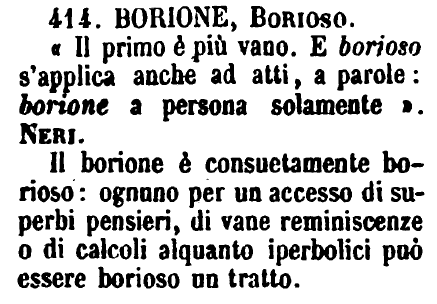 | Borione, Borioso - «Il primo è più vano. E borioso s'applica anche ad atti, a parole: borione a persona solamente». Neri.