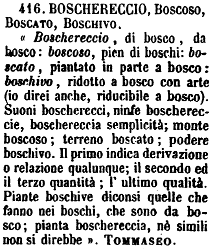 | Boschereccio, Boscoso, Boscato, Boschivo - «Boschereccio, di bosco, da bosco: boscoso, pien di boschi: boscato, piantato in parte a bosco: boschivo, ridotto a bosco con arte (io direi anche, riducibile a bosco). Suoni boscherecci, ninfe boschereccie, boschereccia semplicità; monte boscoso; terreno boscato; podere boschivo. Il primo indica derivazione o relazione qualunque; il secondo ed il terzo quantità; l'ultimo qualità. Piante boschive diconsi quelle che fanno nei boschi, che sono da bosco; pianta boschereccia, nè simili non si direbbe». Tommaseo. [immagine] |
