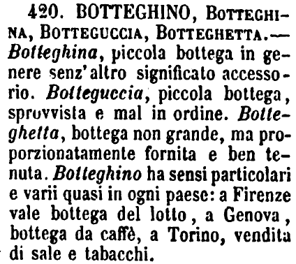 | Botteghino, Botteghina, Botteguccia, Botteghetta - Botteghina, piccola bottega in genere senz'altro significato accessorio. Botteguccia, piccola bottega, sprovvista e mal in ordine. Botteghetta, bottega non grande, ma proporzionatamente fornita e ben tenuta. Botteghino ha sensi particolari e varii quasi in ogni paese: a Firenze vale bottega del lotto, a Genova, bottega da caffè, a Torino, vendita di sale e tabacchi. [immagine] |