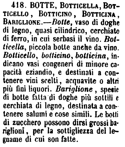 | Botte, Botticella, Botticello, Botticino, Botticina, Bariglione - Botte, vaso di doghe di legno, quasi cilindrico, cerchiato di ferro, in cui serbasi il vino. Botticella, piccola botte anche da vino. Botticello, botticino, botticina, indicano vasi congeneri di minore capacità eziandio, e destinati a contenere vini scelti, acquavite o altri più fini liquori. Bariglione, specie di botte fatta di doghe più sottili e cerchiata di legno, destinata a contenere salumi e cose simili. Le botti di zucchero possono dirsi grossi bariglioni, per la sottigliezza del legname di cui son fatte. [immagine] |