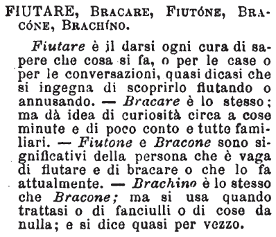 | Fiutare, Bracare, Fiutone, Bracone, Brachino - Fiutare è il darsi ogni cura di sapere che cosa si fa, o per le case o per le conversazioni, quasi dicasi che si ingegna di scoprirlo fiutando o annusando. - Bracare è lo stesso; ma dà idea di curiosità circa a cose minute e di poco conto e tutte familiari. - Fiutone e Bracone sono significativi della persona che è vaga di fiutare e di bracare o che lo fa attualmente. - Brachino è lo stesso che Bracone; ma si usa quando trattasi o di fanciulli o di cose da nulla; e si dice quasi per vezzo. [immagine] |