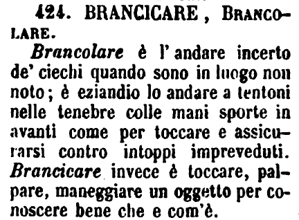 | Branciare, Brancolare - Brancolare è l'andare incerto de' ciechi quando sono in luogo non noto; è eziandio lo andare a tentoni nelle tenebre colle mani sporte in avanti come per toccare e assicurarsi contro intoppi impreveduti. Brancicare invece è toccare, palpare, maneggiare un oggetto per conoscere bene che e com'è. [immagine] |