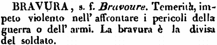 | Bravura - s.f. Bravoure. Temerità, impeto violento nell'affrontare i pericoli della guerra o dell'armi. La bravura è la divisa del soldato. [immagine] |