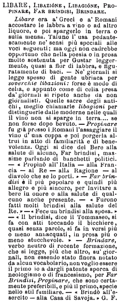 | Libare, Libazione, Libagione, Propinare, Far brindisi, Brindare - Libare era a' Greci e a' Romani accostare le labbra a vino o ad altro liquore, e poi spargerlo in terra o sulla mensa. Taluno l'usa pedantescamente ne' sensi più speciali alle voci seguenti; ma oggi non cadrebbe opportuno che nella poesia o in prosa molto sostenuta per Gustar leggermente, quasi a fior di labbra, e figuratamente di baci. - Ne' giornali si legge spesso di gente ubriaca per soverchie libazioni: forse è modo di celia, e appunto come di celia presa da' giornali si ripete anche da non giornalisti. Quelle sacre degli antichi, meglio chiamarle libagioni per distinguerle dalle moderne nelle quali il vino non si sparge in terra.... se non forse dopo bevuto. - Propinare fu già presso i Romani l'assaggiare il vino d'una coppa e poi porgerla altrui in atto di familiarità e di benevolenza. Oggi si dice del Bere alla salute di alcuno, Far brindisi, massime parlando di banchetti politici. - « Propinò all'Italia - alla Francia - al Re - alla Ragione - al diavolo che se lo porti. » - Far brindisi è il più popolare e quindi più allegro e più sincero, per Invitare a bere in onore o alla salute di qualcuno anche presente. - « Furono fatti molti brindisi alla salute del Re. » - « Fece un brindisi alla sposa. » - « Il brindisi, dice il Tommaseo, si fa con atti toccando il bicchiere, quasi senza parole, si fa in versi più o meno annacquati, in prosa più o meno stucchevole. » - Brindare, verbo neutro di recente formazione, che si legge, più che altro, su' giornali, non essendo stato finora notato da alcun vocabolario, non voglio essere il primo io a dargli patente sporca di neologismo o di francesismo, per Far Brindisi, Propinare, che sono certamente preferibili, e più il primo, specie nello stil familiare. - « Brindò all'esercito - alla Casa di Savoja. » G. F. [immagine] |