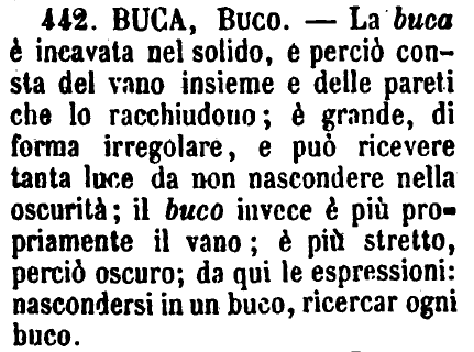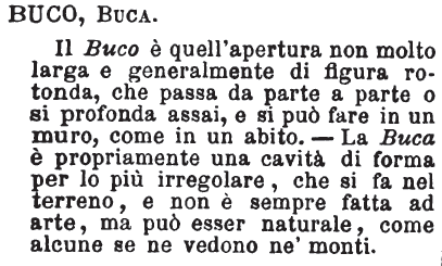 | Buco, Buca - Il Buco è quell'apertura non molto larga e generalmente di figura rotonda, che passa da parte a parte o si profonda assai, e si può fare in un muro, come in un abito. - La Buca è propriamente una cavità di forma per lo più irregolare, che si fa nel terreno, e non è sempre fatta ad arte, ma può esser naturale, come alcune se ne vedoni ne' monti. [immagine] |