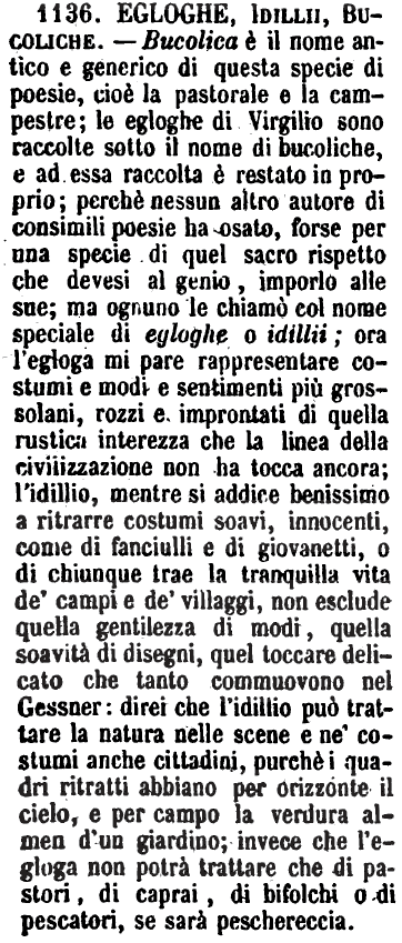 | Egloghe, Idillii, Bucoliche - Bucolica è il nome antico e generico di questa specie di poesie, cioè la pastorale e la campestre; le egloghe di Virgilio sono raccolte sotto il nome di bucoliche, e ad essa raccolta è restato in proprio; perchè nessun altro autore di consimili poesie ha osato, forse per una specie di quel sacro rispetto che devesi al genio, imporlo alle sue; ma ognuno le chiamò col nome speciale di egloghe o idillii; ora l'egloga mi pare rappresentare costumi e modi e sentimenti più grossolani, rozzi e improntati di quella rustica interezza che la linea della civilizzazione non ha tocca ancora; l'idillio, mentre si addice benissimo a ritrarre costumi soavi, innocenti, come di fanciulli e di giovanetti, o di chiunque trae la tranquilla vita de' campi e de' villaggi, non esclude quella gentilezza di modi, quella soavità di disegni, quel toccare delicato che tanto commuovono nel Gessner: direi che l'idillio può trattare la natura nelle scene e ne' costumi anche cittadini, purchè i quadri ritratti abbiano per orizzonte il cielo, e per campo la verdura almen d'un giardino; invece che l'egloga non potrà trattare che di pastori, di caprai, di bifolchi o di pescatori, se sarà peschereccia. [immagine] |