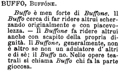 | Buffo, Buffone - Buffo è men forte di Buffone. Il Buffo cerca di far ridere altrui scherzando originalmente e con piacevolezza. - Il Buffone fa ridere altrui anche con scapito della propria dignità. Il Buffone, generalmente, non è altro se non un adulatore d'altri e di sè; il Buffo no. Nelle opere teatrali si chiama Buffo chi fa la parte giocosa. [immagine] |