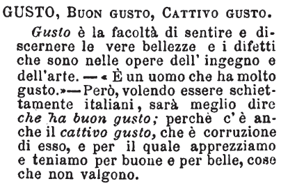 | Gusto, Buon gusto, Cattivo gusto - Gusto è la facoltà di sentire e discernere le vere bellezze e i difetti che sono nelle opere dell'ingegno e dell'arte. - «È un uomo che ha molto gusto.» - Però volendo essere schiettamente italiani, sarà meglio dire che ha buon gusto; perchè c'è anche il cattivo gusto, che è corruzione di esso, e per il quale apprezziamo e teniamo per buone e per belle, cose che non valgono. [immagine] |