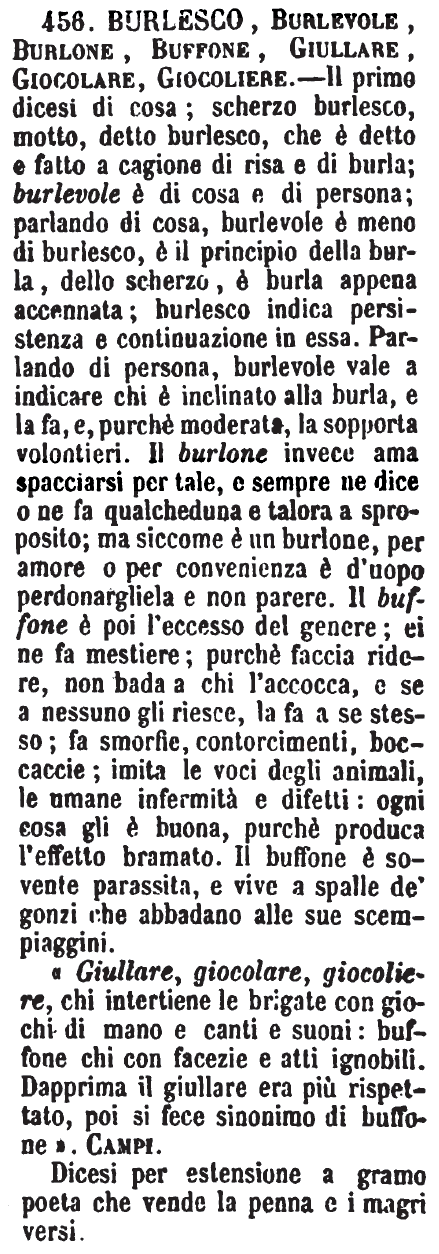| Burlesco, Burlevole, Burlone, Buffone, Giullare, Giocolare, Giocoliere - Il primo dicesi di cosa; scherzo burlesco, motto, detto burlesco, che è detto e fatto a cagione di risa e di burla; burlevole è di cosa e di persona; parlando di cosa, burlevole è meno di burlesco, è il principio della burla, dello scherzo, è burla appena accennata; burlesco indica persistenza e continuazione in essa. Parlando di persona, burlevole vale a indicare chi è inclinato alla burla, e la fa, e, purchè moderata, la sopporta volontieri. Il burlone invece ama spacciarsi per tale, e sempre ne dice o ne fa qualcheduna e talora a sproposito; ma siccome è un burlone, per amore o per convenienza è d'uopo perdonargliela e non parere. Il buffone è poi l'eccesso del genere; ei ne fa mestiere; purchè faccia ridere, non bada a chi l'accocca, e se a nessuno gli riesce, la fa a se stesso; fa smorfie, contorcimenti, boccaccie; imita le voci degli animali, le umane infermità e difetti: ogni cosa gli è buona, purchè produca l'effetto bramato. Il buffone è sovente parassita, e vive a spalle de' gonzi che abbadano alle sue scempiaggini.